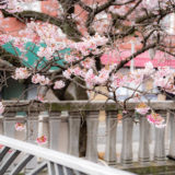川沿いに咲き誇る濃いピンク色の桜が、街を一気に春色に染めています。