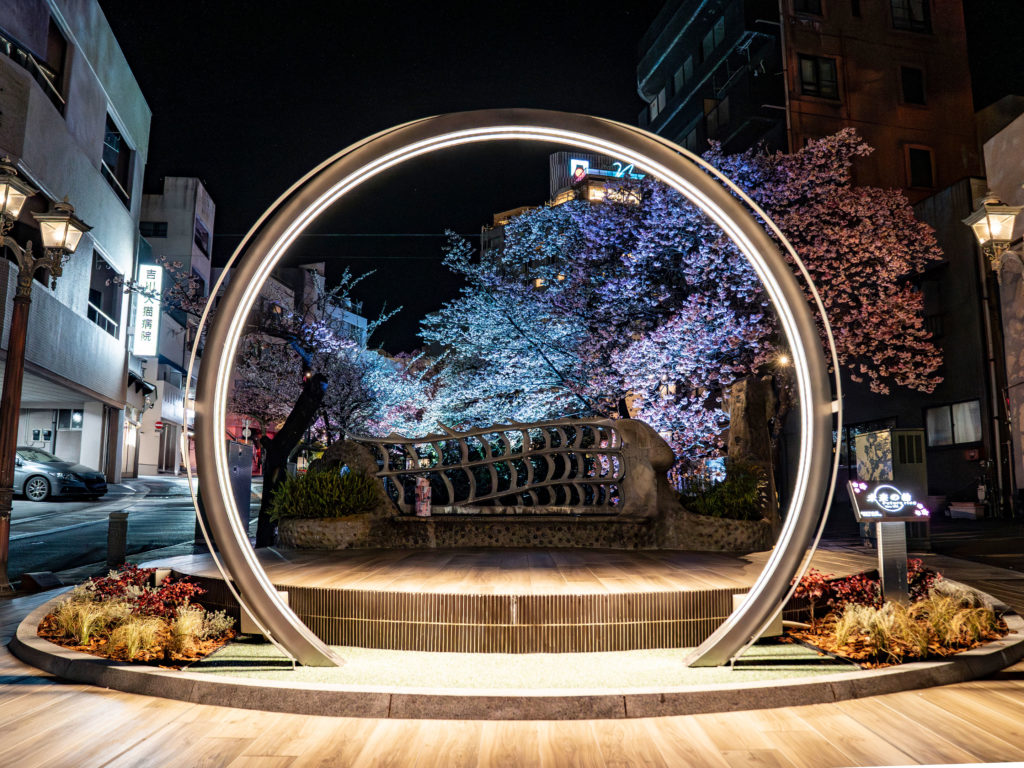 糸川遊歩道では、夜になると桜のライトアップも実施。