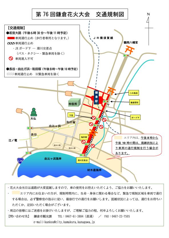 当日、鎌倉駅~由比ヶ浜海岸・材木座海岸において18時30分から交通規制を実施します。